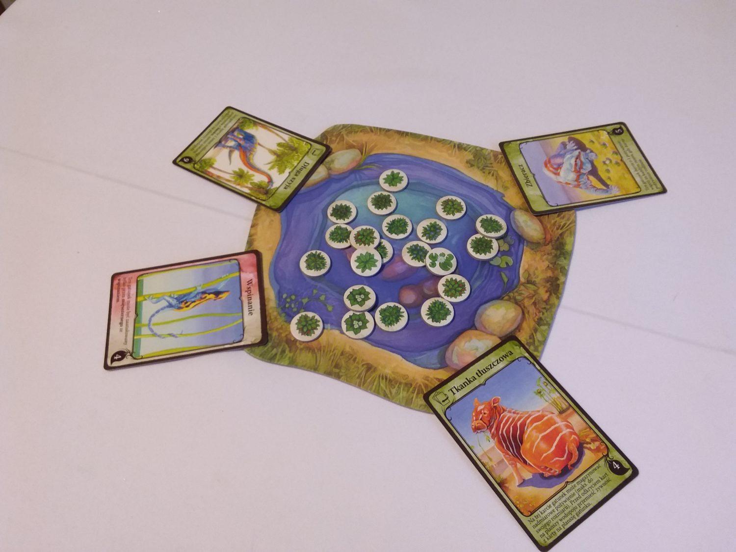 Ostatnia faza to żywienie. Na początku odkrywamy karty, które gracze zagrali do wodopoju podczas fazy drugiej. Sumujemy wartości na „listkach” i dodajemy (lub w przypadku wyniku ujemnego usuwamy) wskazaną liczbę znaczników jedzenia. Jeśli nasz gatunek ma cechę z odpowiednią ikonką, to przed odsłonięciem kart mamy prawo odpalić daną kartę. Następnie przechodzimy do kluczowego dla wyników gry pozyskiwania żywności. W kolejności każdy z graczy musi nakarmić jeden głodny gatunek, czyli taki, który na swojej planszetce ma mniej znaczników pożywienia, niż wynosi jego wielkość. W przypadku roślinożerców sprawa jest prosta, żywić się można jedzeniem z wodopoju, biorąc jeden żeton na raz, chyba że cecha naszego gatunku mówi inaczej. Roślinożercy czekają grzecznie i jedzą zgodnie po jednym żetonie. Sprawa zmienia się, jeśli któryś gatunek otrzyma cechę mięsożercy. Takie zwierzę nigdy nie może jeść roślin, żywi się, polując na inne gatunki. Tutaj do gry wchodzi druga wartość opisująca nasze zwierzęta, czyli rozmiar. Mięsożerca może polować tylko na gatunki mające mniejszy rozmiar od niego, musi też umieć zneutralizować cechy obronne swojego celu. Jeśli chcemy najeść się kimś pod ochroną Krzyku Ostrzegawczego, sami musimy mieć Zasadzkę. Cel obniża swoją populację o jeden (wymierając, jeśli spadnie ona do zera), a polujący dostaje tyle znaczników pożywienia, ile wynosi wielkość jego celu. Świetnym pomysłem jest zasada mówiąca, że jeśliś nasz drapieżnik może zapolować jedynie na inny z naszych gatunków, to nadal musimy to zrobić! Zwierzęcy głód nie zna litości.