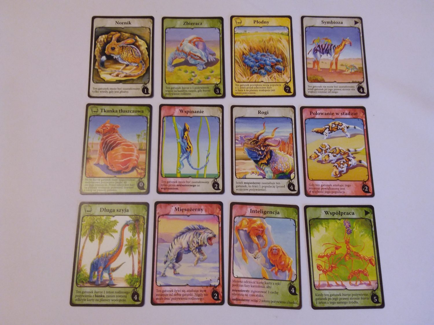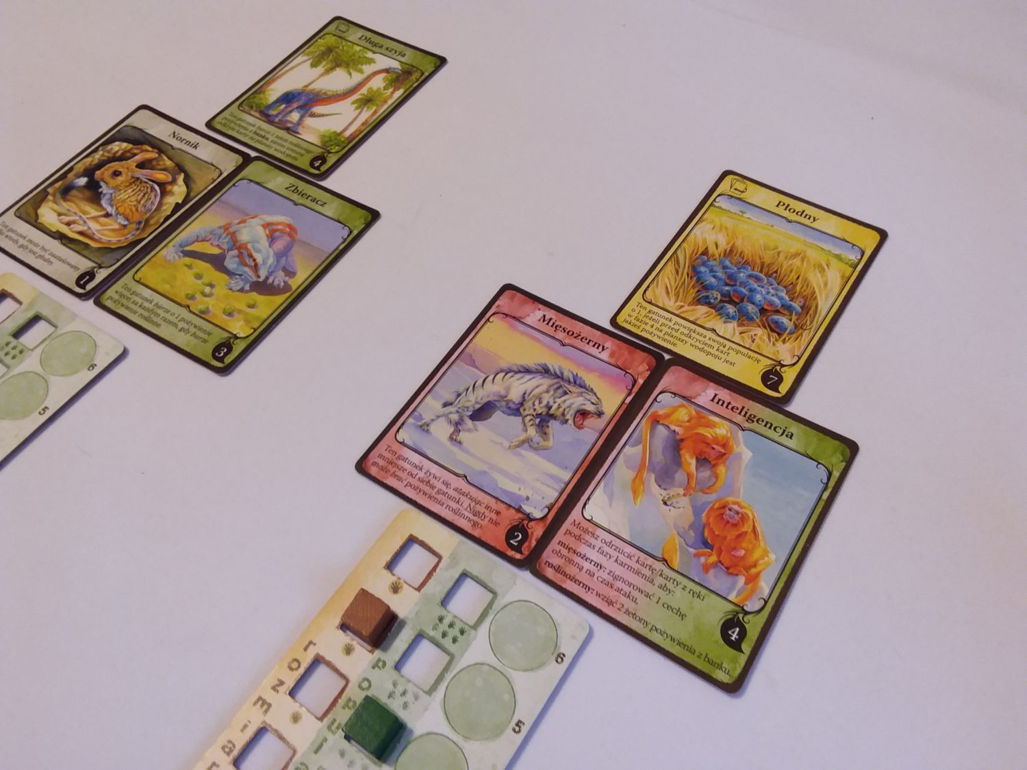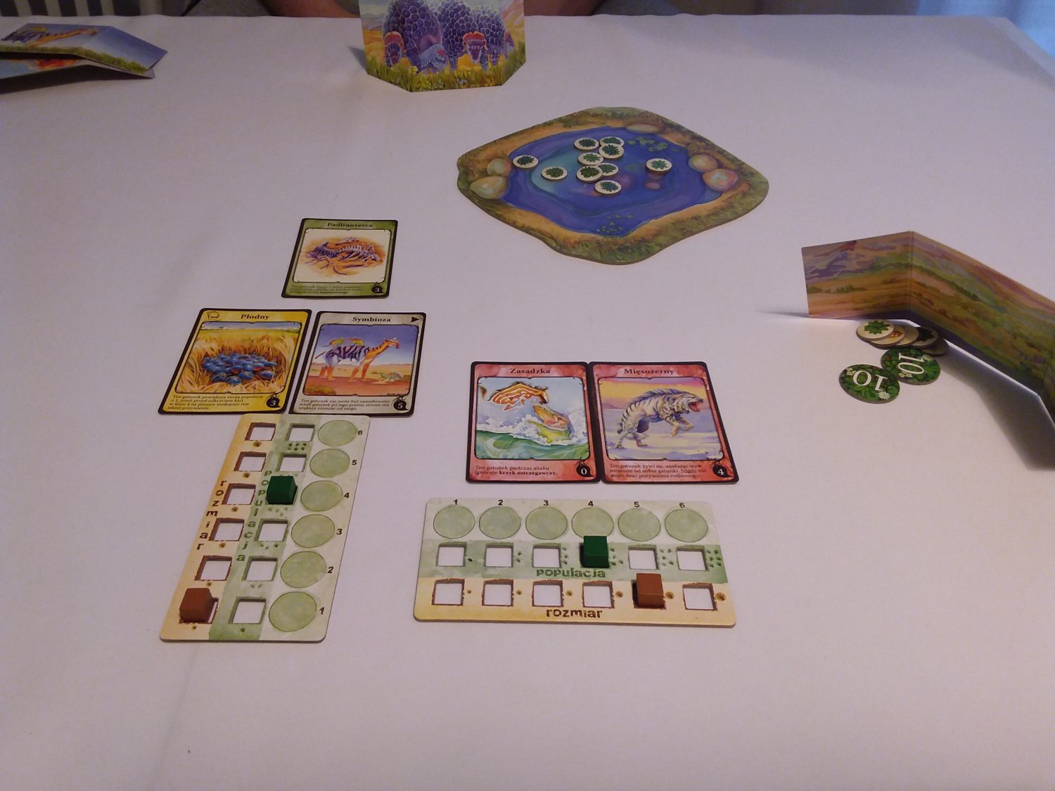 W ten sposób faza toczy się do czasu, kiedy wszyscy są już wyżywieni albo nikt już nie może pozyskać jedzenia. Jeśli któryś gatunek nie najadł się do syta, to jego populacja spada do liczby znaczników jedzenia, które zdobył. Następnie gracze chowają wszystkie pozyskane żetony za nieszczęsną zasłonkę, zmieniają pierwszego gracza i rozpoczynają kolejną rundę. Gra toczy się w ten sposób do wyczerpania talii cech. Na koniec do jedzenia zdobytego podczas gry dodajmy punkty za liczbę cech i populację naszych gatunków i wyłaniamy zwycięzcę.