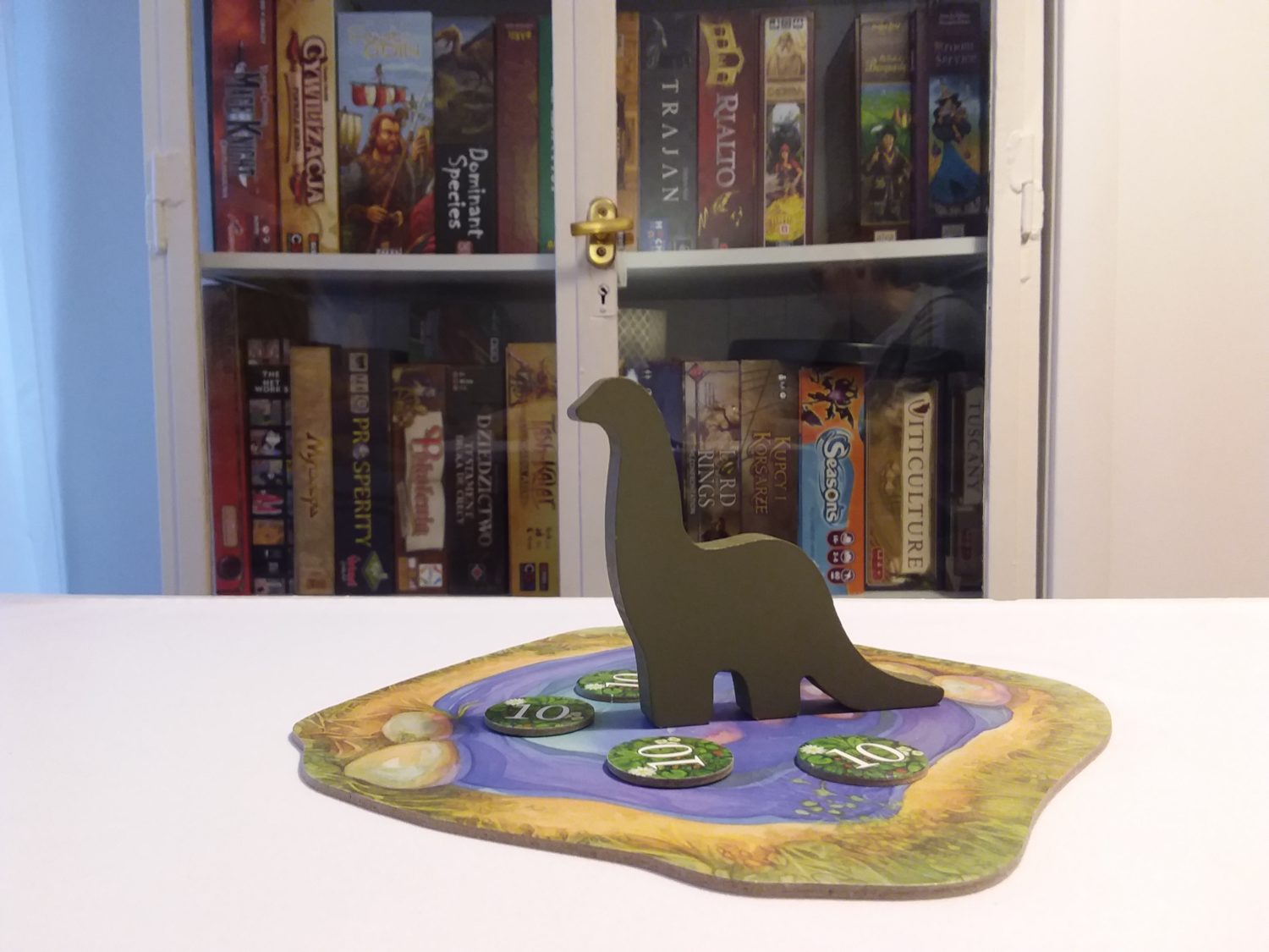 Całości dopełniają solidne żetony pożywienia i piękna planszetka wodopoju, na którą trafiają. Hitem jest niewątpliwie ogromny pionek pierwszego gracza, który przedstawia dinozaura. Jego wielkość jest niczym nieuzasadniona, jednak ładnie wygląda na planszy i zawsze cieszy, kiedy trafia w nasze ręce.
